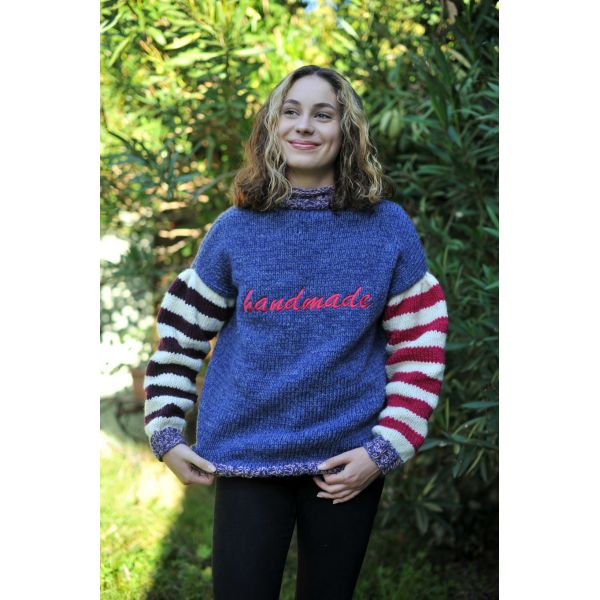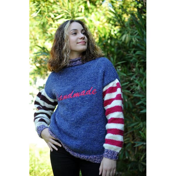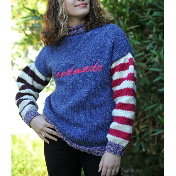 Il est réalisé en Merino Wool di Luce 8mm pour les manches (écru, fuchsia, prune) et