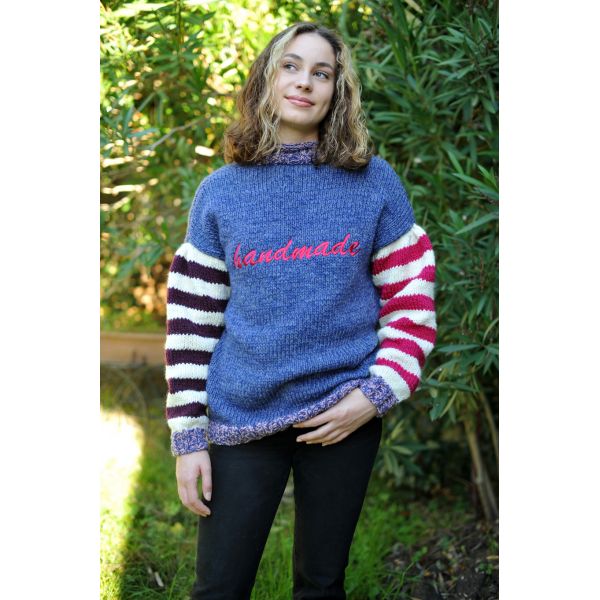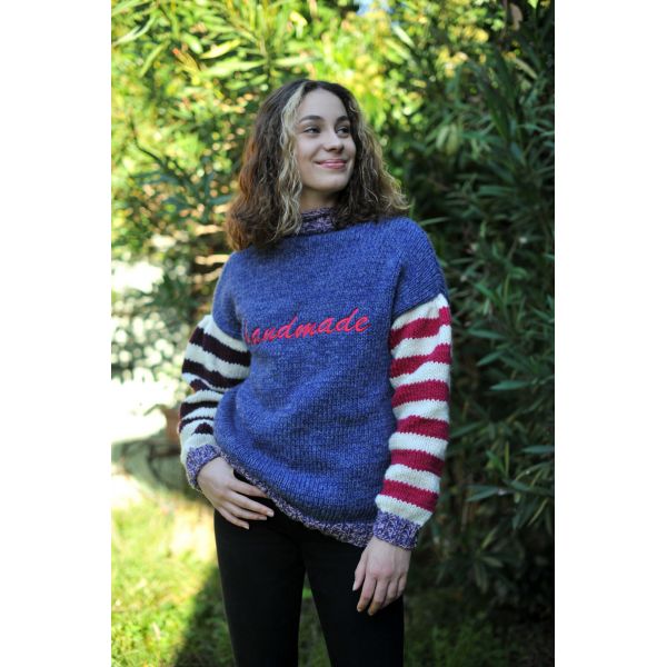 Il est réalisé en Merino Wool di Luce 8mm pour les manches (écru, fuchsia, prune) et