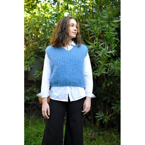 le Kit Débardeur SAFRAN est réalisé en Mohair di Luce. Il comprend la laine et les explications sont envoyées par email.