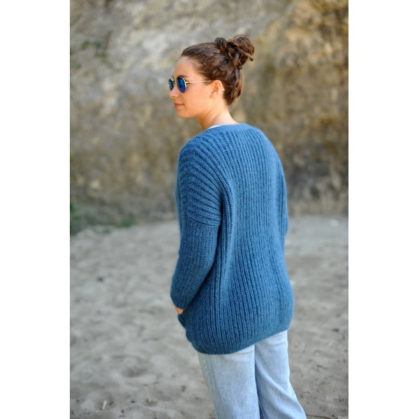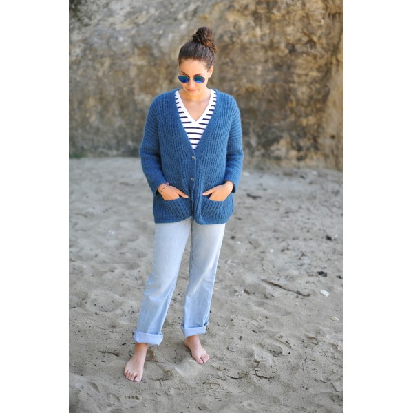 Le modèle de présentation est réalisé en DDL 2 fils coloris lumière slave + kid silk 27 coloris bleu jean taille 38/40