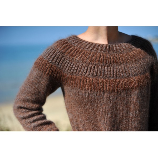 Le modèle de présentation est réalisé en DDL 2 fils coloris bois sacré + kid silk coloris chocolat taille 38.