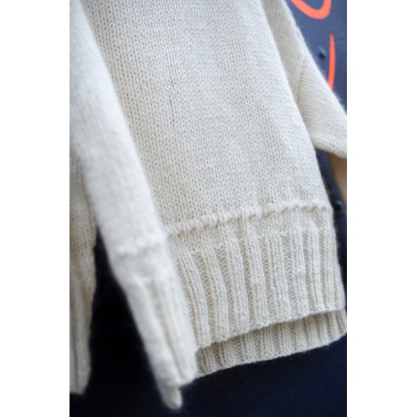 Le modèle de présentation est réalisé en merino wool 8 mm coloris nude + kid silk coloris écru taille 38.
