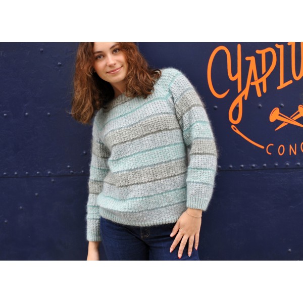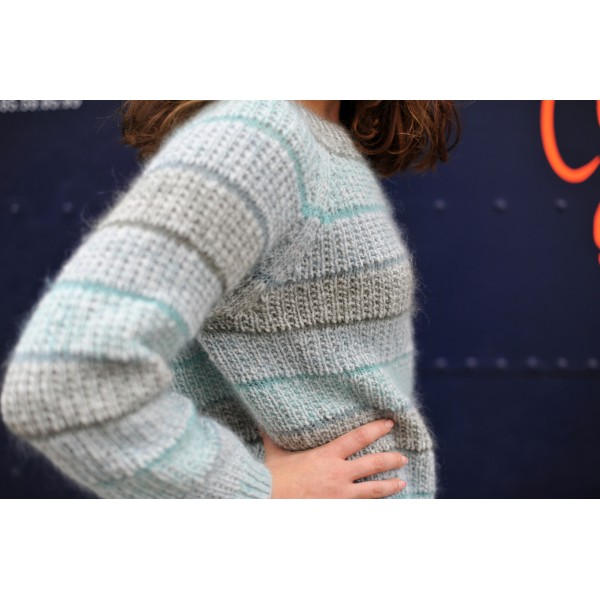 Le modèle de présentation est réalisé en Merino wool 5,5 mm coloris givre sacré + kid silk .