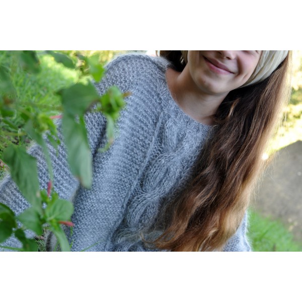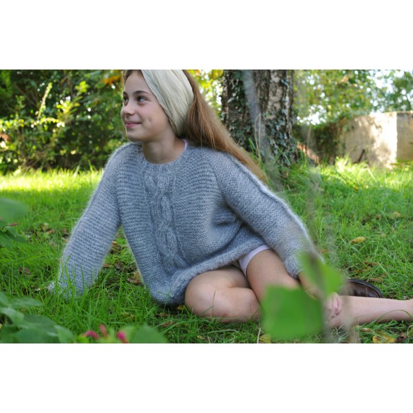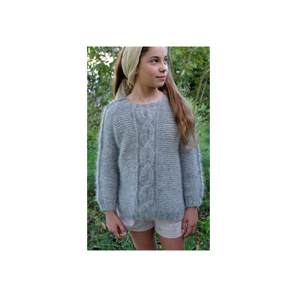Le modèle de présentation est réalisé en DDL 2 fils coloris turbulences + kid silk 01 coloris écru taille 12 ans