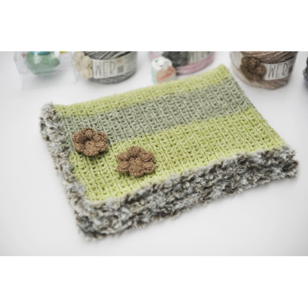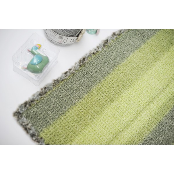 Il est réalisé en Flower, le bord est tricoté en même temps que la couverture au point mousse en flower.