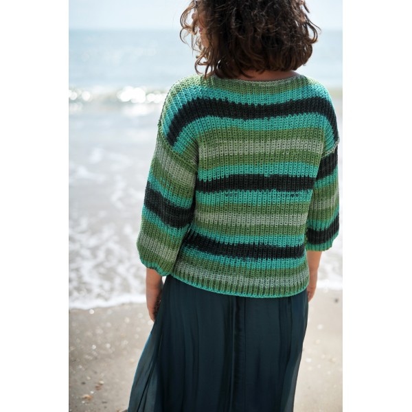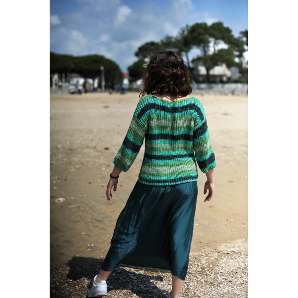 Le KIT pull réversible (coutures apparentes sur une face) expliqué en aller-retour et en circulaire sans coutures, SOLVERT est réalisé en Sol Dégradé, il comprend la laine, et les explications sont envoyées par email.