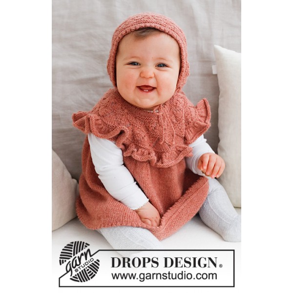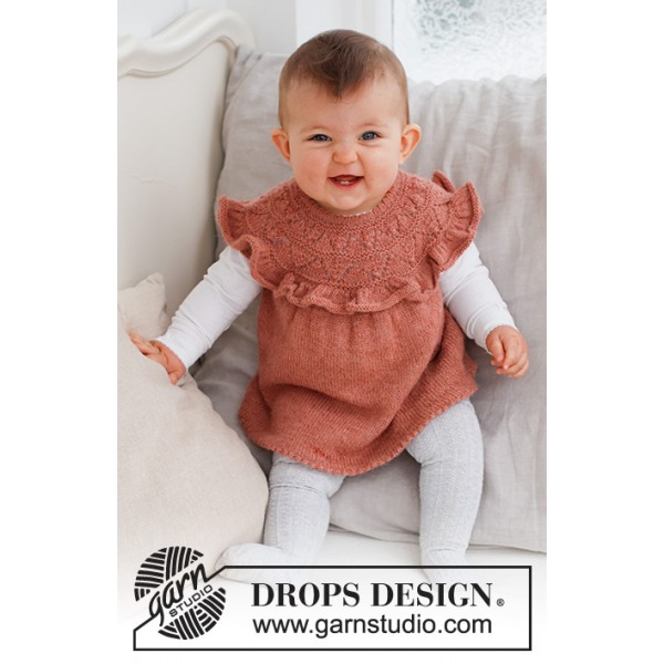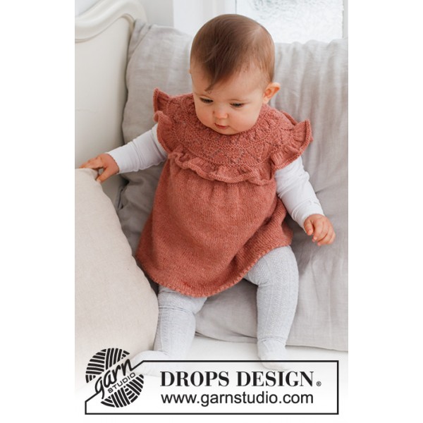 Robe tricotée de haut en bas pour bébé avec empiècement arrondi, point ajouré et volant sur l'empiècement, en DROPS Alpaca. Du 0 – 6 ans.
