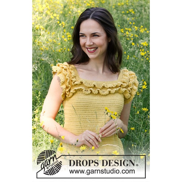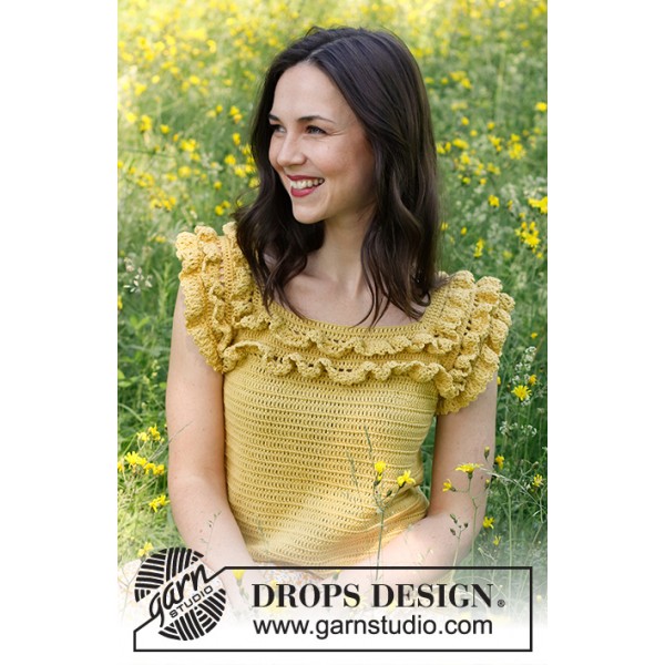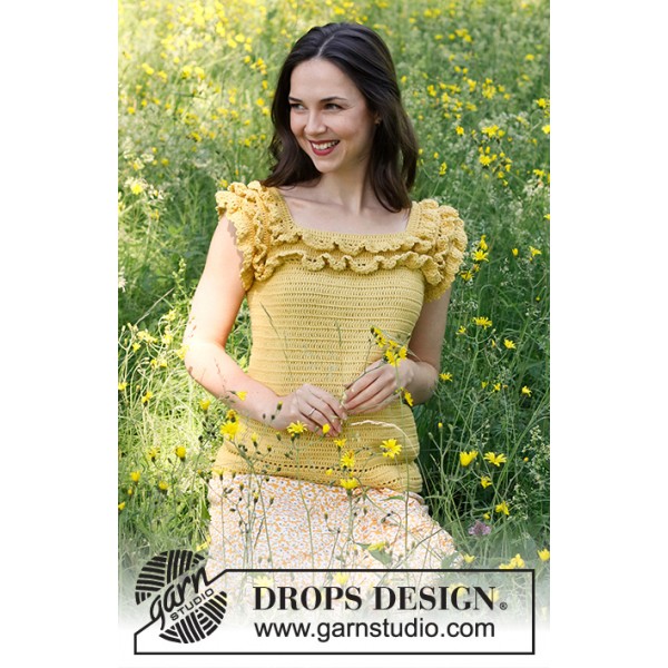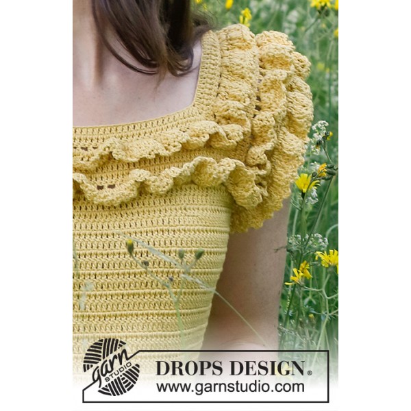 Top crocheté de haut en bas avec emmanchures raglan et volants, en DROPS Safran. Du S au XXXL