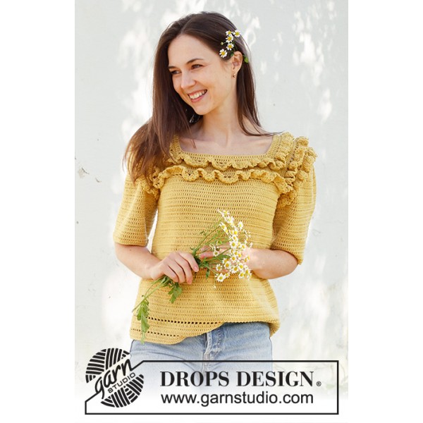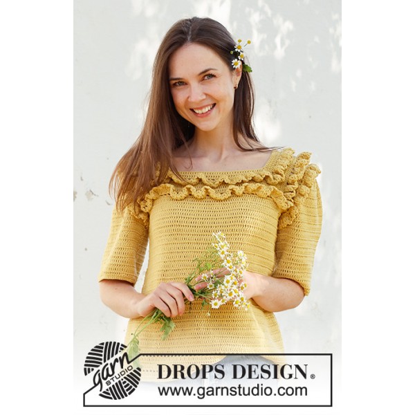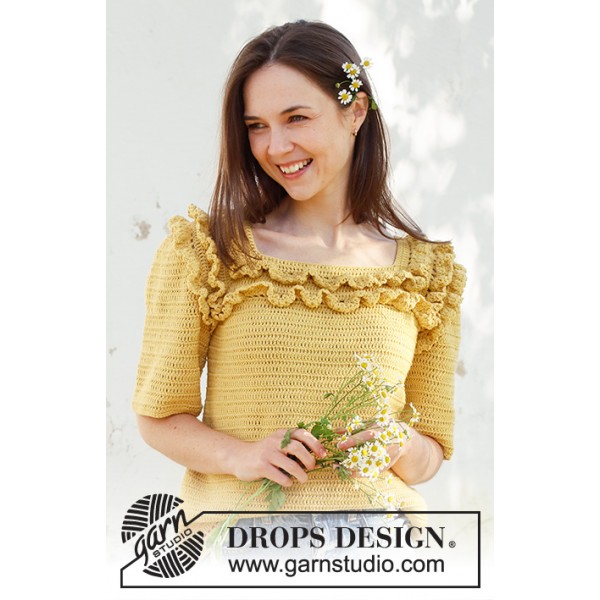Pull crocheté de haut en bas avec manches courtes, emmanchures raglan et volants, en DROPS Safran. Du S au XXXL