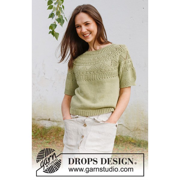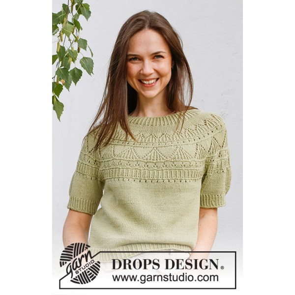 Pull / T-shirt tricoté de bas en haut avec empiècement arrondi, point ajouré et relief, en DROPS Safran. Du S au XXXL.