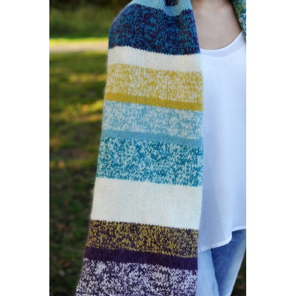 Le modèle de présentation est réalisé en Dolce di Luce 2 fils coloris glacier, nude, encre d'écolier, brindille, bois sacré pour la version sobre, souvenir, nude, source vive, cumin, pause pour la version punchy.