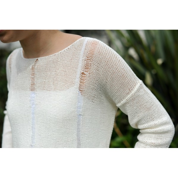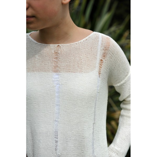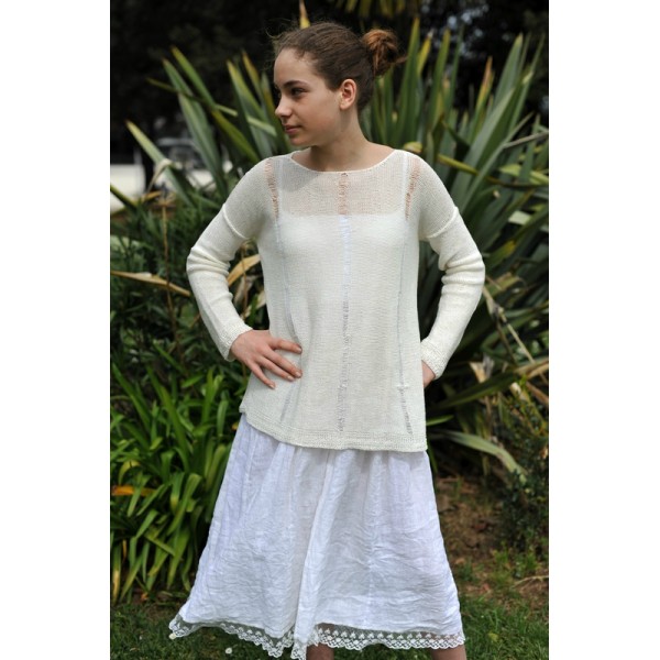Réalisé en Yoga de Bouton d'or 100% lin, décoré de séries de mailles lâchées de 10 cm de haut, décalées à droite et à gauche.