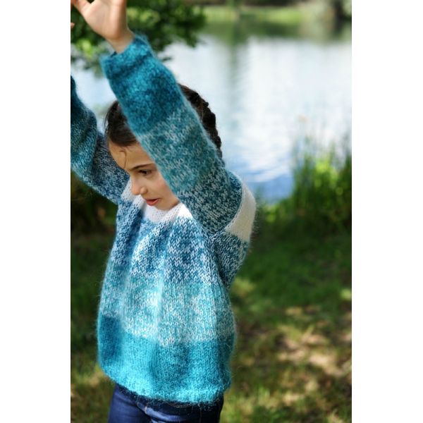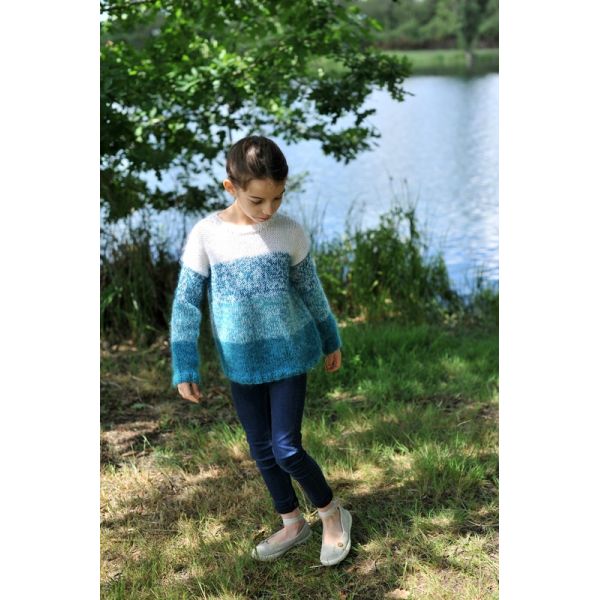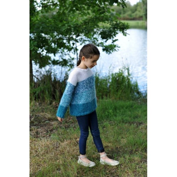 Le kit pull Truite enfant est réalisé en Fine Kid Libellule d'anny Blatt, Merino 150 Blanc de Lang Yarns et Dolce di Luce Source Vive.